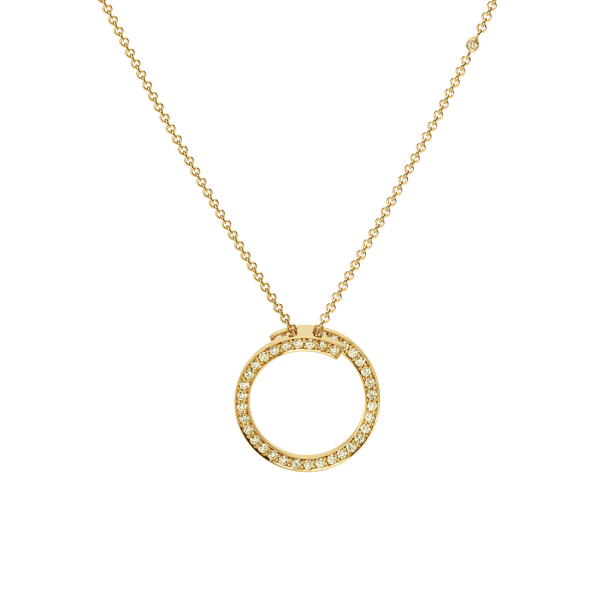 Unsere SATURN Neuheit: der eindrucksvolle große SATURN Anhänger wird getragen von einer durchlaufenden Kette. Ein wunderbares Glitzern von vorn und von der Seite dezent mattiertes Gold oder Platin. Das Besondere: Die Enden des offenen Kreises laufen übereinander und sind ebenfalls vollständig mit Brillanten ausgefasst – so funkelt es aus jedem Winkel.