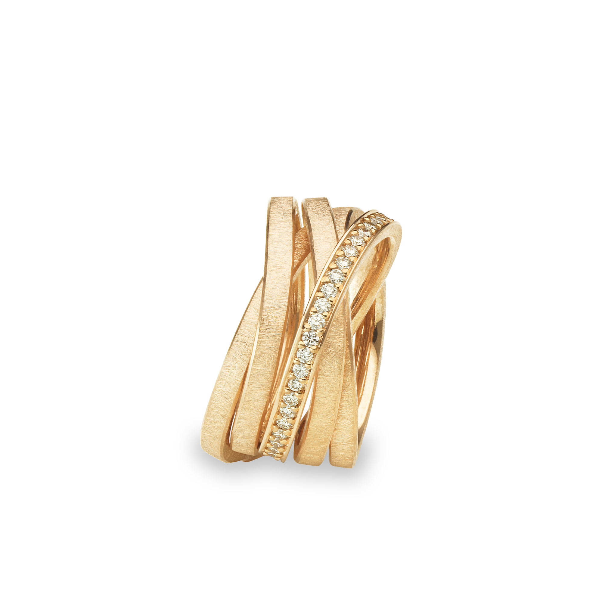 Unsere SATURN Neuheit: bei diesem KETTENRING sind die einzelnen Ringe leicht gewellt – dezent und verspielt gleiten sie über- und untereinander. Ein Ring der zum spielen einlädt und bei jeder Bewegung sein Aussehen ändert. Unsere KETTENRINGE in Rotgold und Gelbgold fertigen wir auf Anfrage auch mit den Brillantringen in Platin an – ein Farbmix, der Eindruck macht.