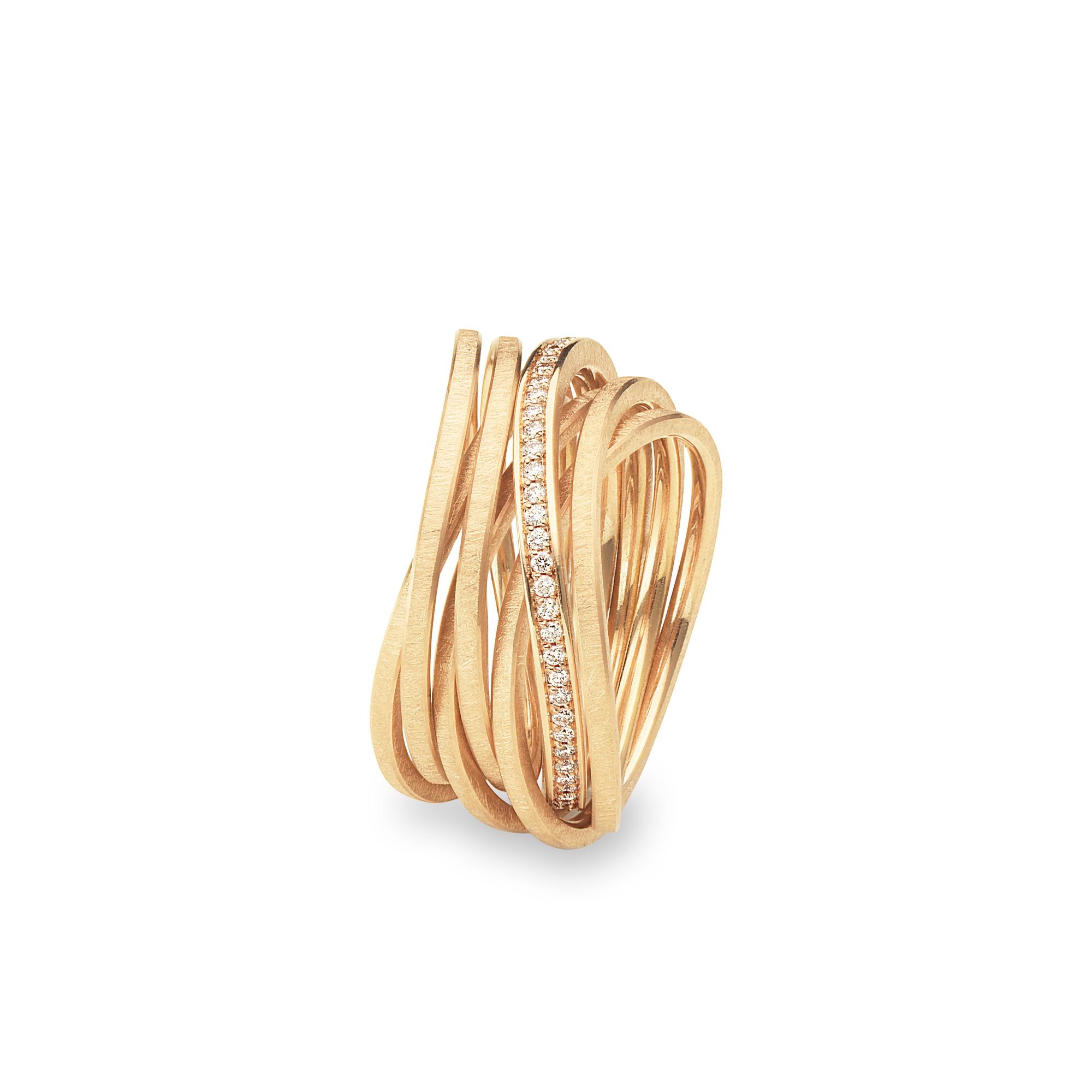 Unsere SATURN Neuheit: bei diesem KETTENRING sind die einzelnen Ringe leicht gewellt – dezent und verspielt gleiten sie über- und untereinander. Ein Ring der zum spielen einlädt und bei jeder Bewegung sein Aussehen ändert. Unsere KETTENRINGE in Rotgold und Gelbgold fertigen wir auf Anfrage auch mit den Brillantringen in Platin an – ein Farbmix, der Eindruck macht.