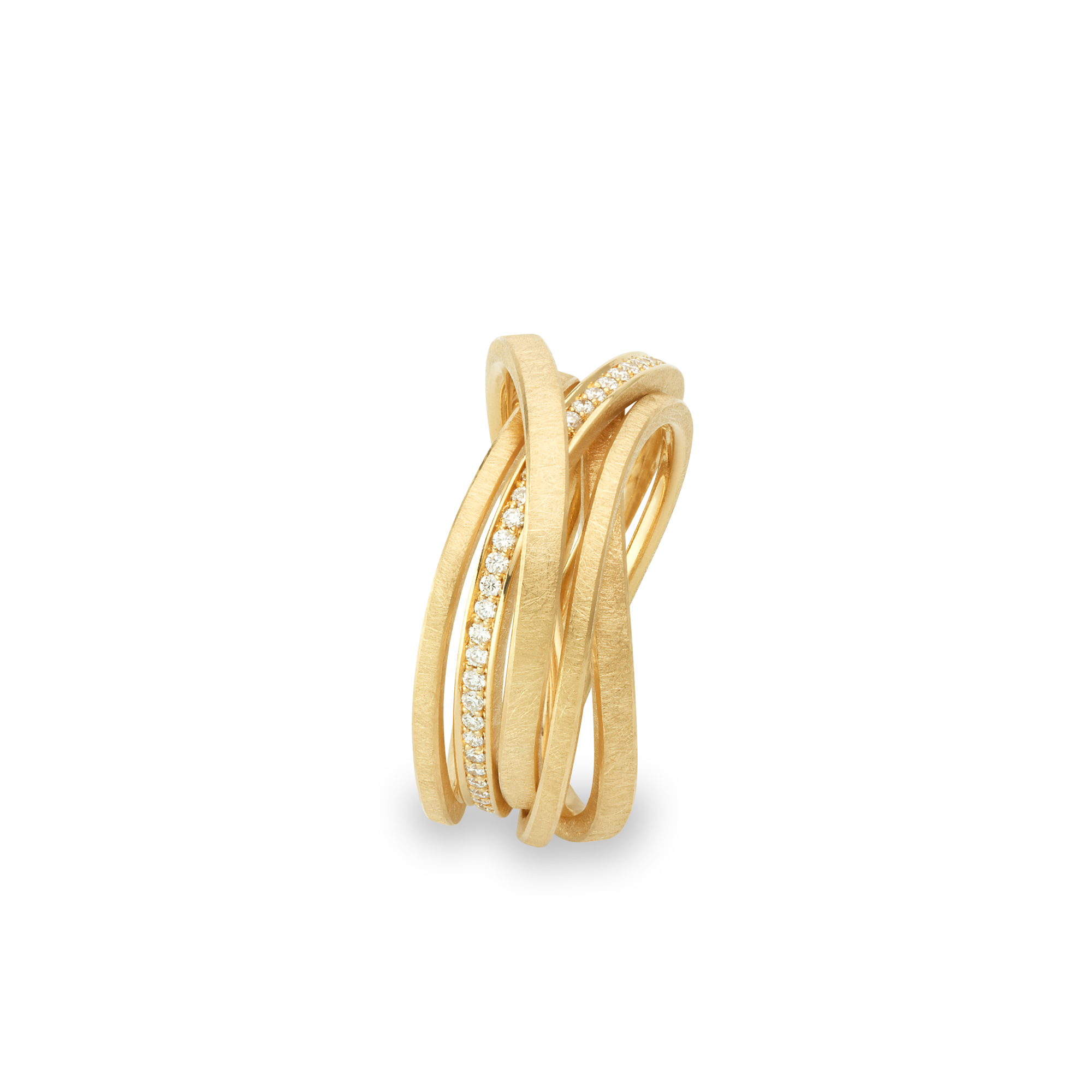 Unsere SATURN Neuheit: bei diesem KETTENRING sind die einzelnen Ringe leicht gewellt – dezent und verspielt gleiten sie über- und untereinander. Ein Ring der zum spielen einlädt und bei jeder Bewegung sein Aussehen ändert. Unsere KETTENRINGE in Rotgold und Gelbgold fertigen wir auf Anfrage auch mit den Brillantringen in Platin an – ein Farbmix, der Eindruck macht.